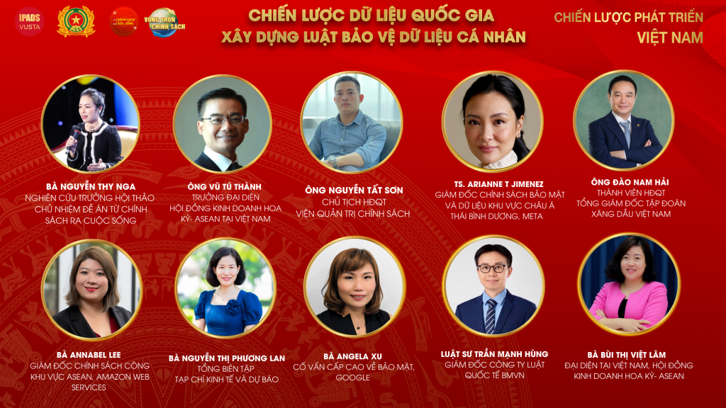 Các khách mời diễn giả chính: Arianne T Jimenez – Giám đốc chính sách bảo mật và dữ liệu khu vực châu Á Thái Bình Dương, Meta; Bà Annabel Lee – Giám đốc chính sách công khu vực ASEAN, Amazon Web Services; GS.TS Trần Thọ Đạt, Hội đồng tư vấn chính sách tài chính, tiền tệ Quốc gia, Thiếu tá Đào Đức Triệu,Cục An ninh mạng và phòng chống tội phạm sử dụng công nghệ cao Bộ Công An, Ông Nguyễn Văn Sự, Phó Tổng Giám đốc Tập đoàn Xăng dầu Việt Nam, Nhà báo Nguyễn Phạm Thu Uyên, Phụ trách hoạt động Thiện Nguyện Như chưa hề có cuộc Chia ly, Bà Đỗ Thị Phương Lan, TBT Tạp chí Kinh tế và Dự báo, Viện Chiến lược phát triển, Bộ Kế hoạch và Đầu tư, Ông Lee Jong Kook, CEO Lotte Vietnam, Bà Angela Xu – Cố vấn cấp cao về bảo mật Google… Thành phần tham gia: Đề án Từ Chính sách ra Cuộc sống, đại diện từ Bộ Công an, ban soạn thảo Dự thảo luật Bảo vệ dữ liệu cá nhân, Bộ Tư pháp, Bộ Thông tin và Truyền thông, Bộ Khoa học và Công nghệ, Hiệp hội an ninh mạng quốc gia, Đại diện các doanh nghiệp trong nước và quốc tế và các chuyên gia. |